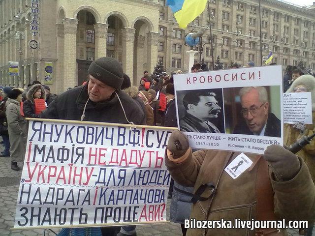 Как написала в своем блоге журналистка Елена Билозерская, людей, поддерживающих Януковича, под сценой тысячи три-четыре. Они держат в руках государственные флаги и флаги Партии регионов. По ее словам, за участие в митинге в поддержку власти пообещали заплатить 110 гривень.