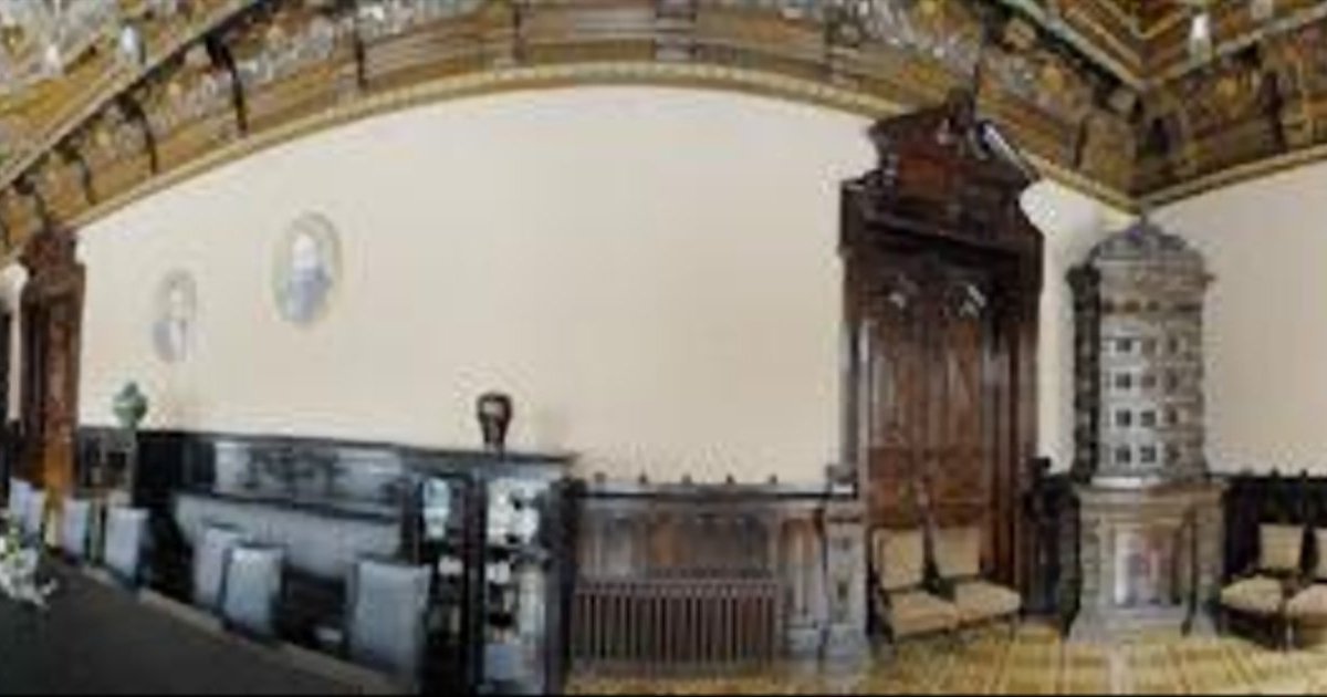 5 - метровые потолки с роскошной лепниной. Шикарные камины и печи, декорированные изразцами, люстры, мраморные подоконники. В зале с темной отделкой и древней мебелью - стол для заседаний писательского актива.