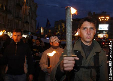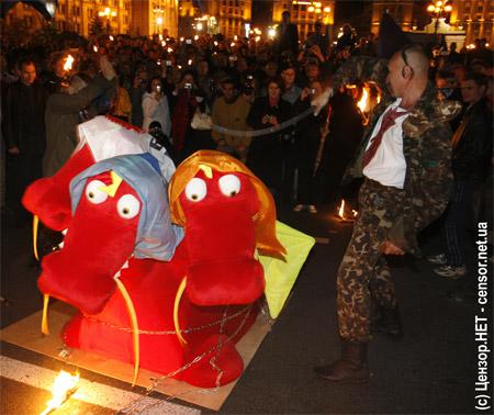Участники акции прошли по центральным улицам Киева с флагами, лозунгами и символикой партии, и завершили акцию митингом на Майдане Независимости со сжиганием символического чучела "Чудо-юдо" и проведением "Народного вече".