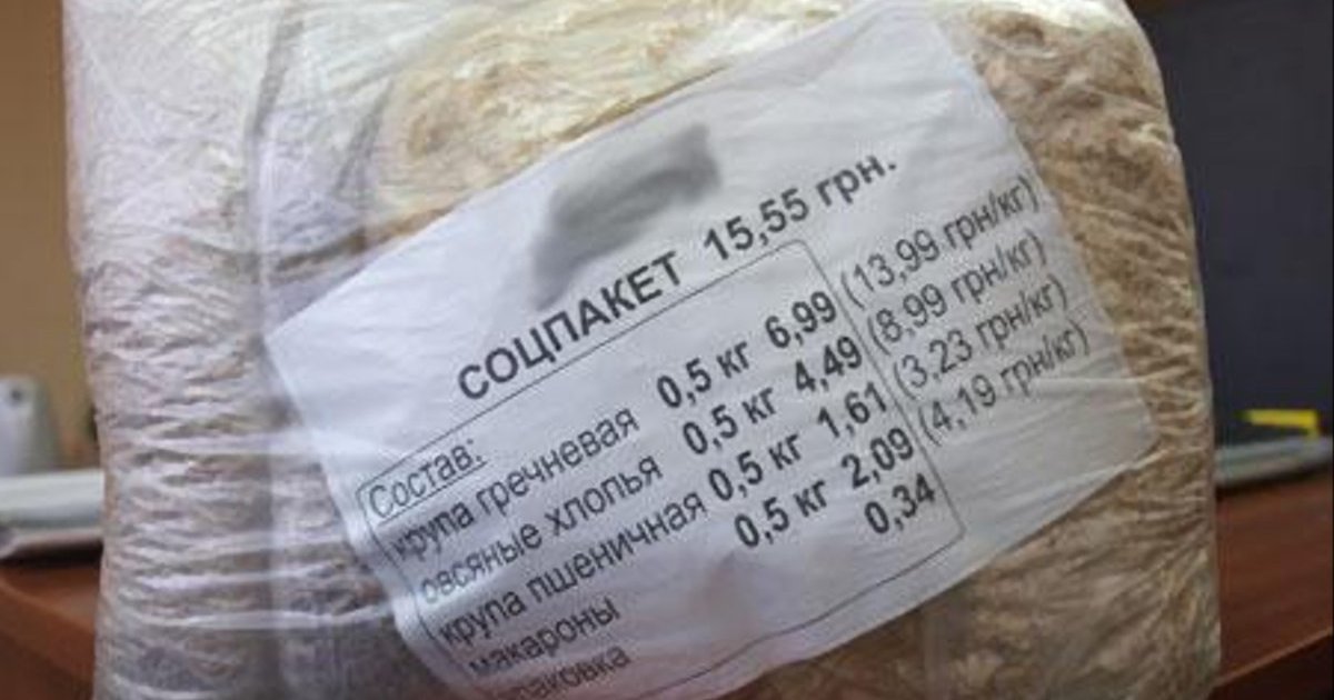 Продукты в наборах собраны из низшей ценовой категории и соответствующего качества. Пережаренная гречка реализуется из расчета 13,99 грн/кг, низкосортная пшеничная крупа – 3,23 грн/кг, осыпающиеся овсяные хлопья – 8,99 грн/кг, изломанные макароны – 4,19 грн/кг. Упаковка пакета обходится в дополнительные 34 копейки.