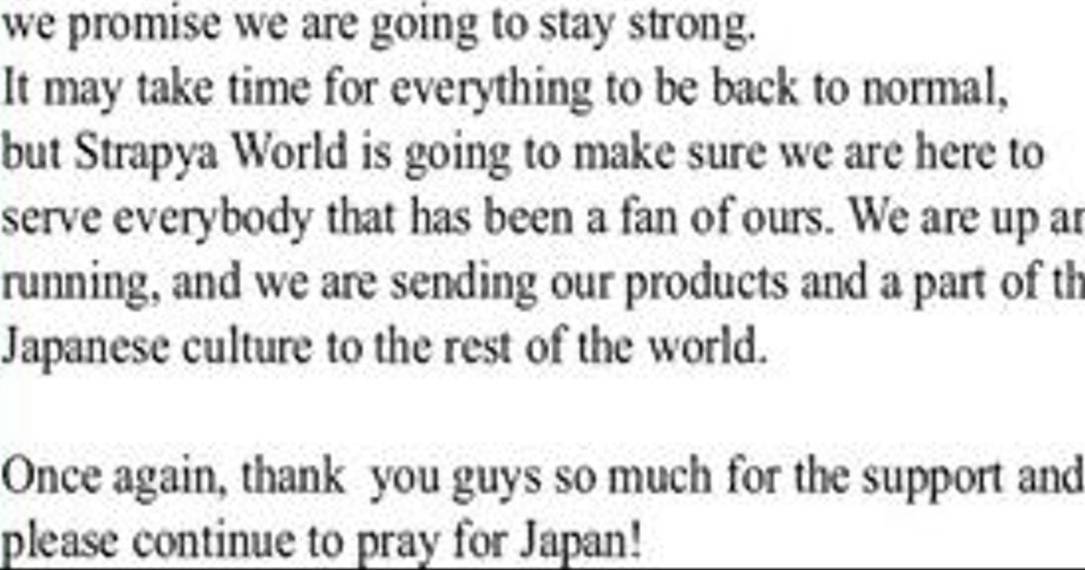 Первое и самое важное - мы хотели бы воспользоваться возможностью поблагодарить вас всех за присланные письма по поводу землетрясения и цунами, поразивших Японию 11 марта. Мы также хотели бы сообщить, что со всеми из Strapya World все хорошо. Даже несмотря на то, что бедствие опустошило всю страну и всех жителей Японии, мы обещаем, что будем оставаться сильными.