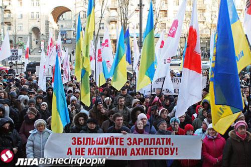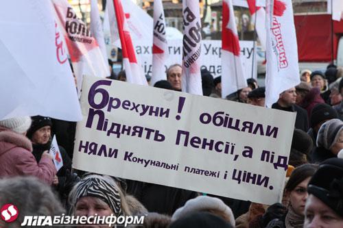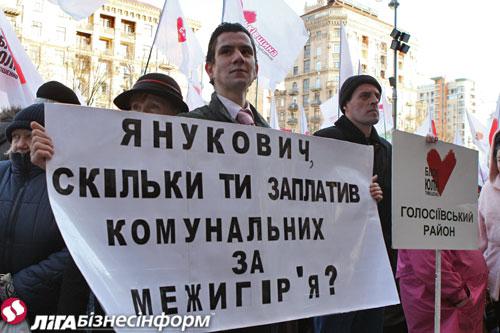 Претензии к власти были написаны на плакатах: «Янукович поднял цены и тарифы, а не экономику!», «Янукович, сколько ты заплатил коммунальных за Межигорье?», «Янукович! Шоб ты жил на минимальную зарплату!», «Настоящая программа Януковича «Ухудшение жизни уже сегодня!», «Украина без людей», «Новые тарифы. Как нам дальше жить?», «Увеличьте зарплату, а не капиталы Ахметову!», «Требуем увеличить зарплату соответственно до уровня инфляции!», «Реформы Януковича-Тигипко – холод и голод!», «Защитим Украину от распродажи!», «Наврали! Обещали поднять пенсии, а подняли коммунальные платежи и цены!».