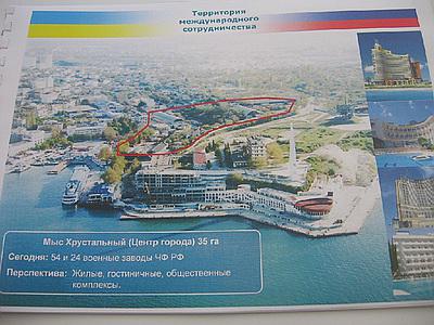 Во-первых, речь идет о 35 гектарах на мысе Хрустальный, где сейчас расположены 54-й и 24-й военные заводы. Там предлагается построить жилые, гостиничные и общественные комплексы. Главный архитектор Севастополя уже предложил эскизное решение застройки. Предполагаемый объем инвестиций – 175 млн долларов.