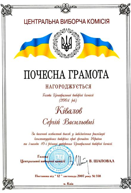 «А в момент острого политического противостояния не спрятался за бюрократические формальности, а провел заседание комиссии и до конца выполнил то что от ЦИК требовал закон, - добавил обладатель почетной грамоты. - Напомню, что на день исторического заседания ЦИК, 24 ноября 2004 года, не существовало ни одного судебного решения, запрещающего ЦИК устанавливать результаты выборов. Зато действовал Закон о выборах, обязывающий ЦИК, а значит и каждого из ее членов, это сделать. И именно протокол этого заседания ЦИК за моей подписью лег в основу юридического спора, разрешенного в Верховном Суде Украины».