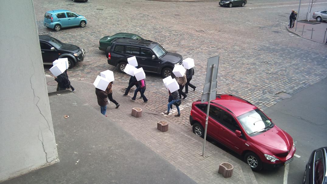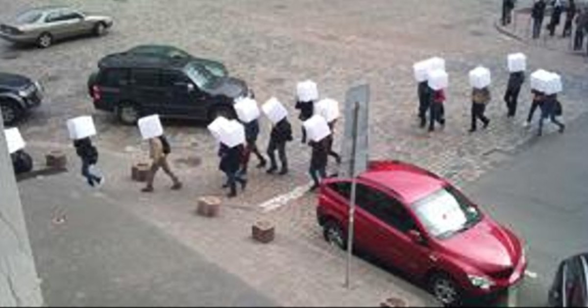 Как передает корреспондент УНН, около 20 молодых людей с белыми бумажными коробками на головах прошлись по улице Владимирской, затем они направились в сторону улицы Богдана Хмельницкого.
