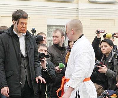 Двое молодых людей в масках Путина и Януковича продемонстрировали собравшимся представление. По сценарию, к «Януковичу» приходит «Путин» в кимоно и угрозами заставляет Украину вступить в Таможенный союз.