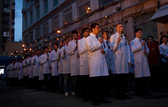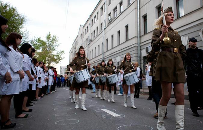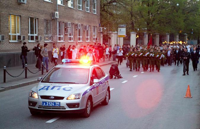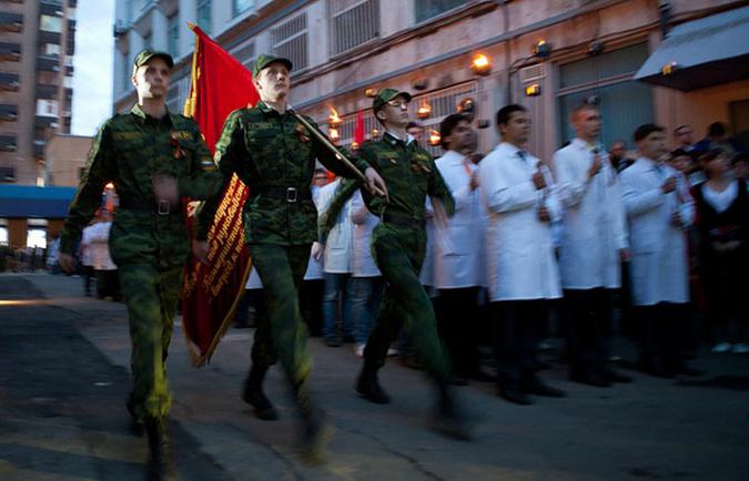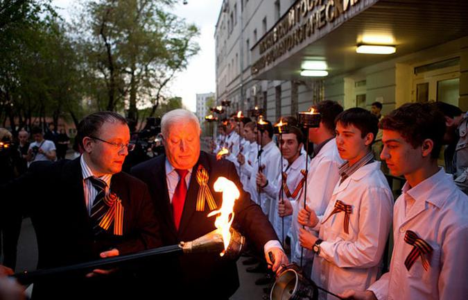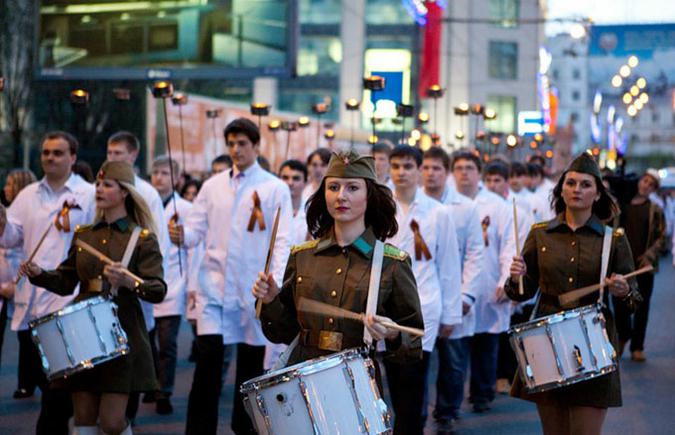 Вечером 5 мая студенты Московского Государственного Медико-Стоматологического Университета провели а Делегатской улице традиционное факельное шествие. Акция проводится в память о погибших на войне выпускниках вуза. Их было 65. Ровно столько же факелов зажигает ректор университета перед началом шествия. В акции приняли участие 23 ветерана ВОВ