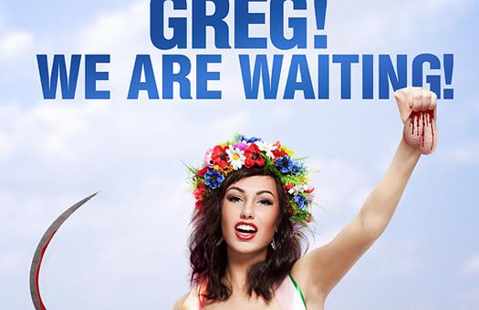 Постеры, созданные при участии активисток FEMEN, были расклеены по всей центральной части Окленда. На них изображена обнаженная женщина, которая держит в одной руке окровавленный серп, а в другой - отрезанные мужские органы с подписью «Greg! We are waiting! Try to win а wife again» (Грег! Мы ждем тебя! Попробуй выиграть жену еще раз).
