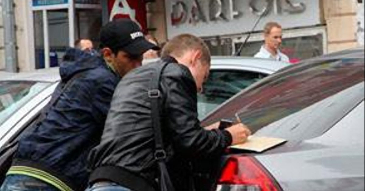 Оперевшись об один с автомобилей вблизи лагеря, молодой человек вписывает фамилия каких-то людей.