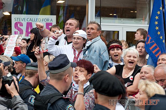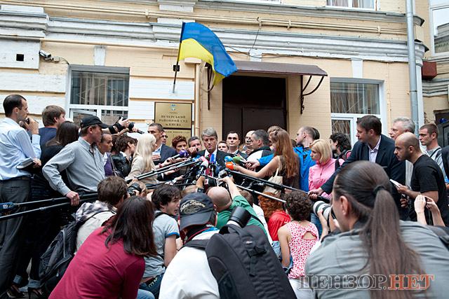Под крики "Ющенко- на нары" экс-президент комментировал прессе свои показания, которые дал в суде.