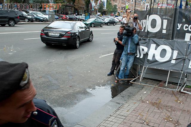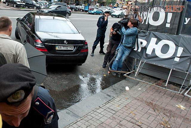 Охрана закрывала машину зонтом, но яйца летели с разных сторон.