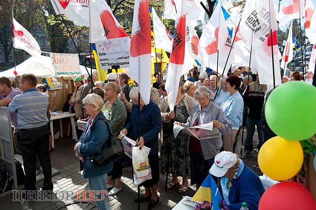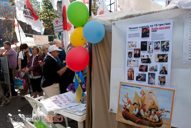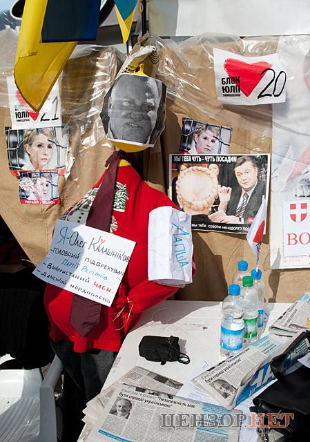 Сегодня у здания Печерского суда продолжается митинг в поддержку Юлии Тимошенко. Сторонники лидера партии "Батькивщина" Юлии Тимошенко подготовили специальный гарбуз для Януковича. А также у палаток можно увидеть чучело Калашникова.