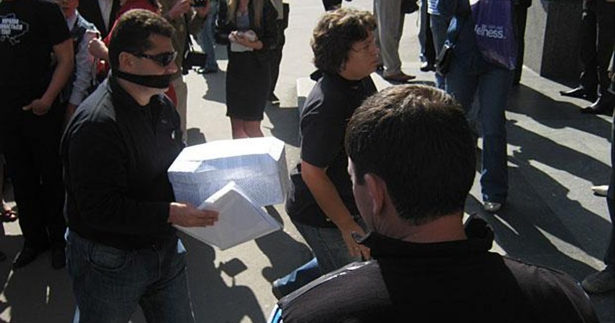 Участники пикета держат плакаты с надписями «Кто кого боится?», «Новости без добавок», «Новостная диета от мэра». У всех журналистов рты завязаны черными лентами.