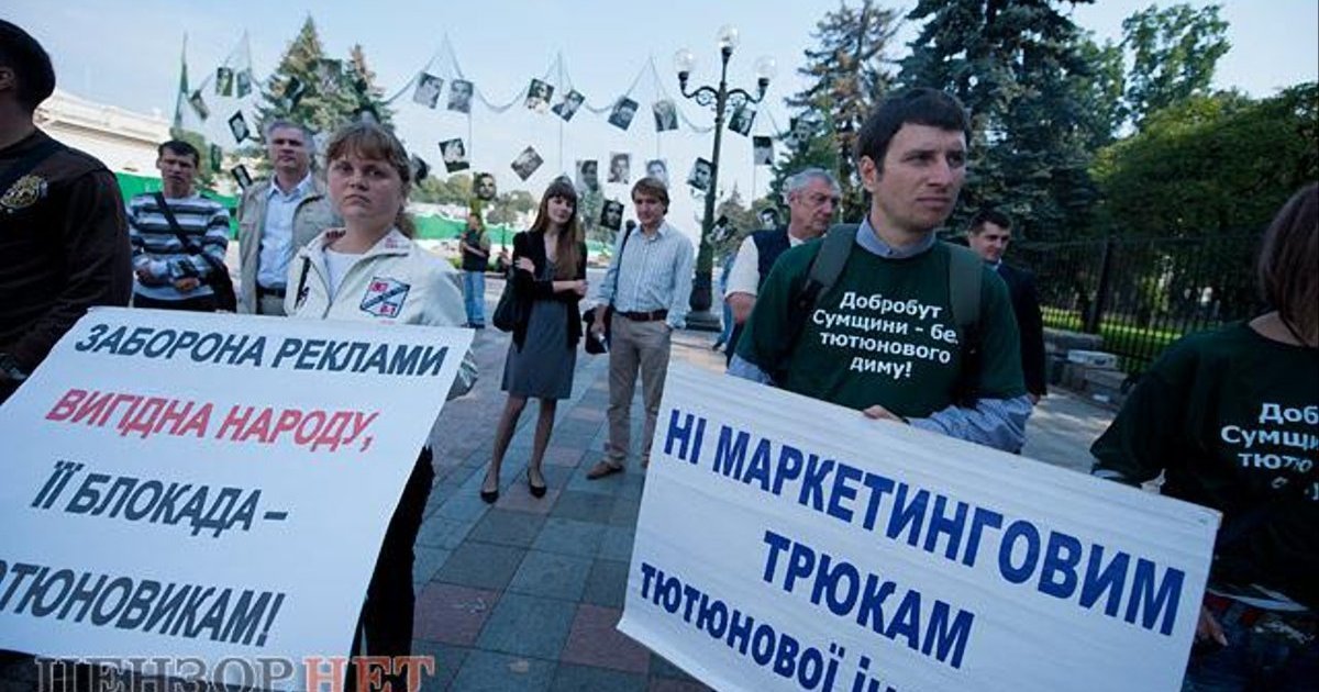 Под Верховной Радой Украины десятки активистов коалиции общественных организаций "За свободную от табачного дыма Украину" требовали от депутатов поддержать законопроект №5164 о запрете в Украине рекламы сигарет.