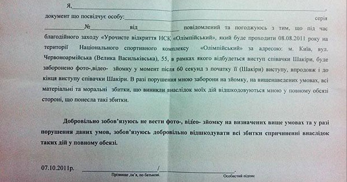 С фотокорреспондентов и телеоператоров, аккредитованных на открытие НСК «Олимпийский» 8 октября 2011 года взяли расписку о том, что они не будут фотографировать и снимать выступление певицы Шакиры дольше одной минуты с начала ее концерта.