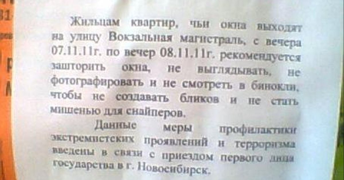 В одном из крупнейших городов Российской Федерации – Новосибирске – перед приездом премьера Владимира Путина жителям запретили выглядывать в окна и смотреть в бинокли, дабы не стать мишенью для снайперов.