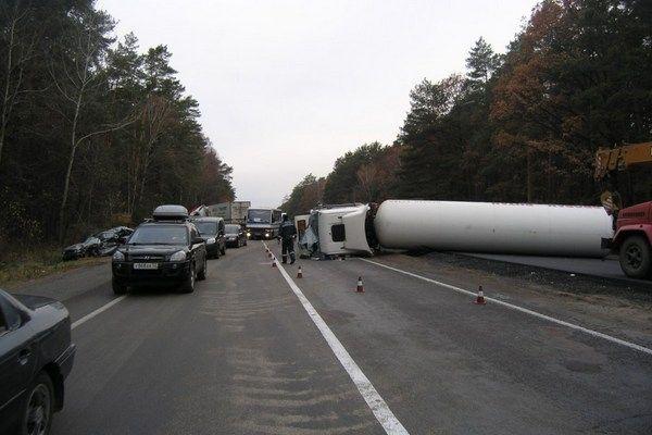 Об этом Цензор.НЕТ сообщили в пресс-службы УГАИ в Житомирской области."Водитель грузовика "Вольво" выехал на полосу встречного движения, где столкнулся с автомобилем "Лада", — сообщил руководитель пресс-службы УГАИ в Житомирской области Николай Яцкевич. – Следовавший за "Вольво" грузовик "ДАФ", не успел вовремя затормозить и угодил в общую кучу. Масштабную аварию еще издали заметил водитель газовоза "МАН". Для того чтобы избежать столкновения, водитель выехал на закрытую в целях ремонта часть дороги и перевернулся".