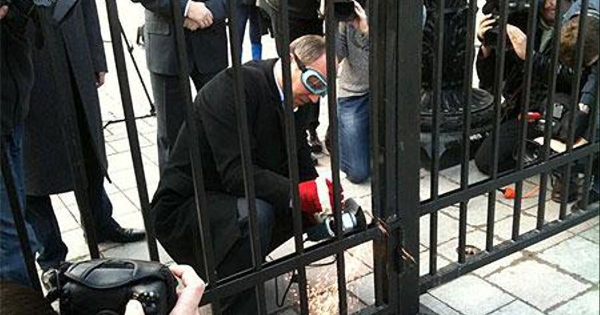 Депутаты от оппозиции пилят болгаркой забор возле Верховной Рады.