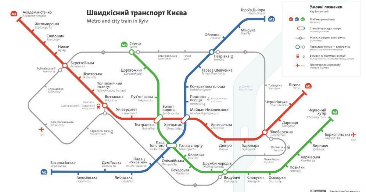 В карту "Скоростного транспорта Киева" вошли: линии метро, городская электричка, вокзал и пригородные станции электрички, транспорт к аэропорту