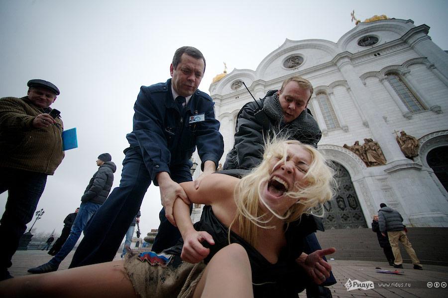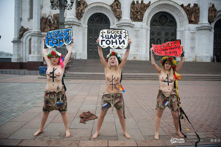 Активистки движения Femen провели в пятницу стремительную акцию у храма Христа Спасителя в центре Москвы. Девушки традиционно скинули одежды до состояния топлесс и развернули плакаты с лозунгом «Боже, царя гони!».