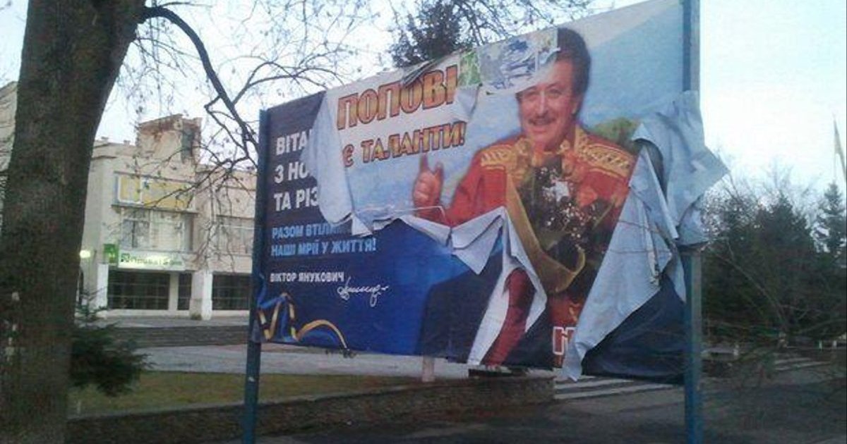 До наклеенного поздравления гаранта на билборде был вывешен анонс фестиваля народного артиста Украины Ивана Поповича. Плакат повредили таким образом, что с новогодними и рождественскими праздниками поздравляет не глава государства, а артист.