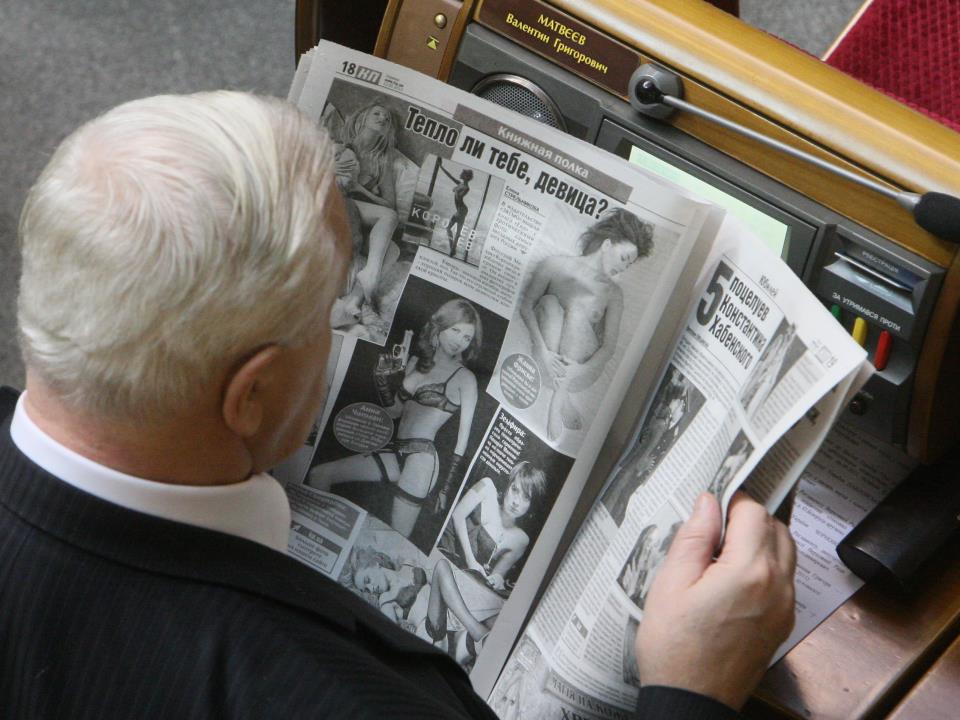 Сегодня в Верховной Раде коммунист Валентин Матвеев, который является заместителем председателя фракции Коммунистической партии, рассматривал фото обнаженных девушек.