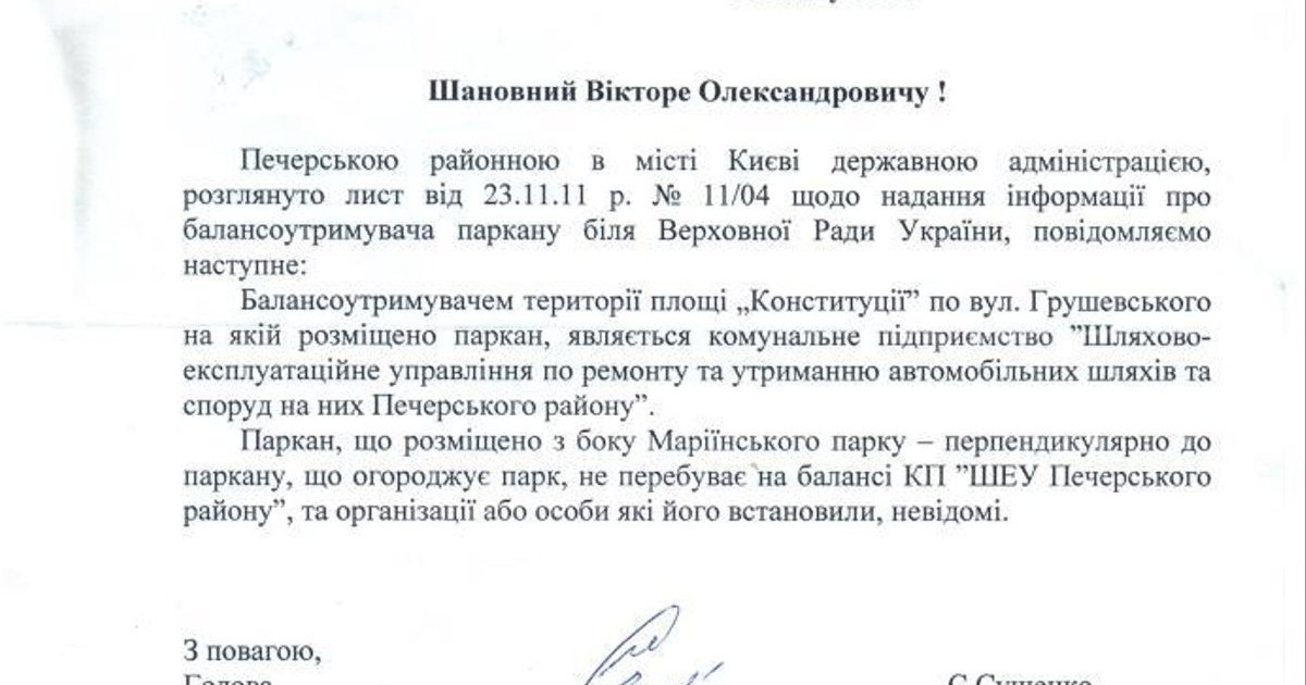" Забор, что расположено со стороны Мариинского парка - перпендикулярно к забору, ограждающий парк, не находятся на балансе КП " ДЭУ Печерсбкого района ", и организации или лица, его установили, НЕИЗВЕСТНЫЕ. "