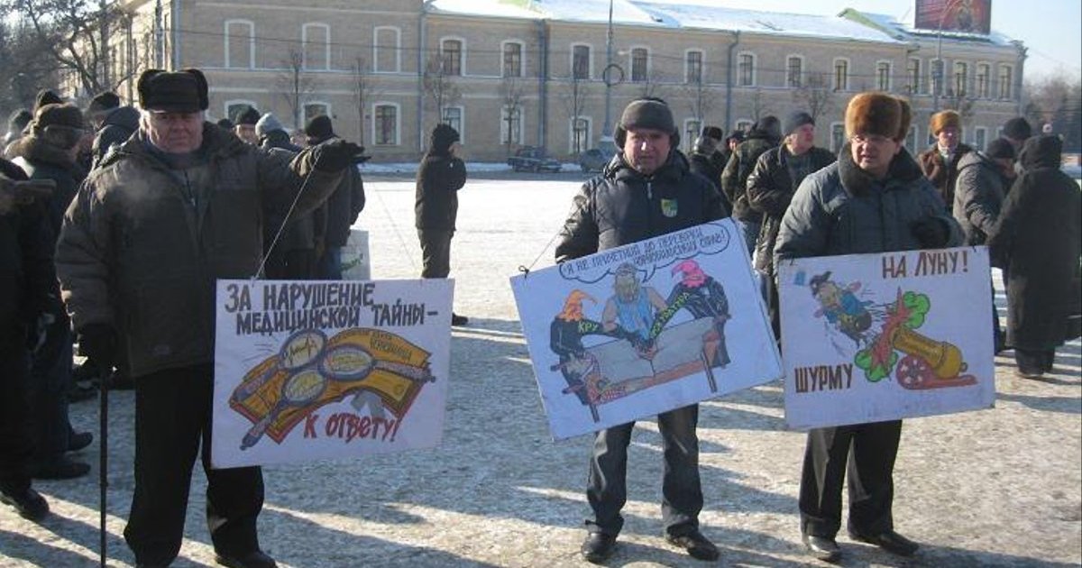 Чернобыльцы требуют провести перерасчет их пенсий и прекращения политических репрессий. Пикетчики держат плакат с надписью «Шурму - на луну!» и «За нарушение медицинской тайны - к ответу»,- сообщает Цензор.НЕТ со ссылкой на comments.