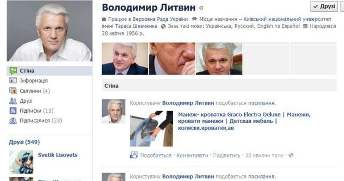 Страницу главы Верховной рады Владимира Литвина на Facebook атаковали хакеры.