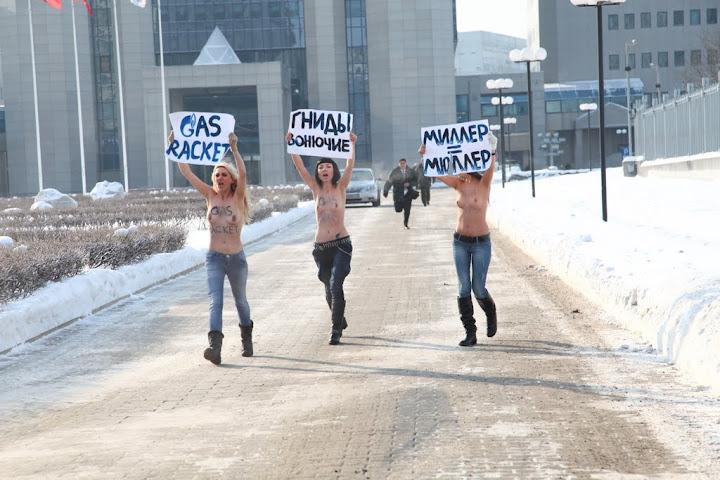 Как отмечается в пресс-релизе, "FEMEN выступает против газового террора, развернутого "Газпромом" в отношении государства Украина в пик холодного периода".