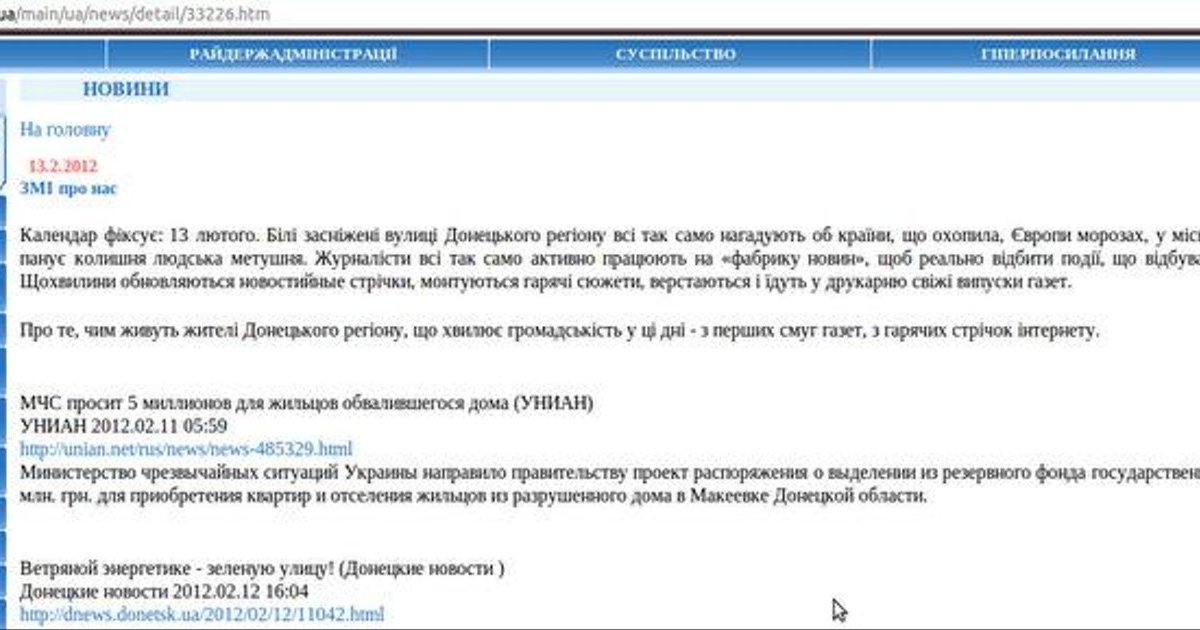 Цитируем: "Календар фіксує: 13 лютого. Білі засніжені вулиці Донецького регіону всі так само нагадують об країни, що охопила, Європи морозах, у міському транспорті панує колишня людська метушня. Журналісти всі так само активно працюють на «фабрику новин», щоб реально відбити події, що відбуваються в області. Щохвилини обновляються новостийные стрічки, монтуються гарячі сюжети, верстаються і їдуть у друкарню свіжі випуски газет".