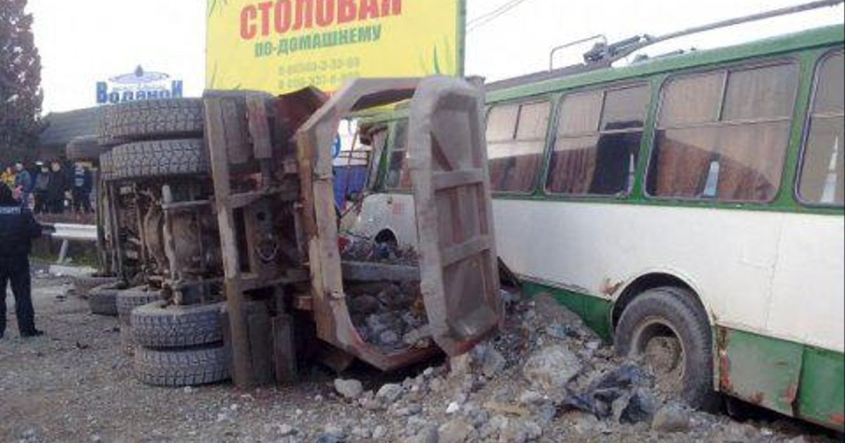 В районе автовокзала Алушты сегодня днем произошло масштабное ДТП. МАЗ, нагруженный строительным мусором, перевернулся и врезался в троллейбус.