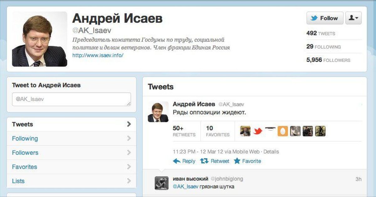 "Ряды оппозиции жидеют", - написал представитель партии власти в своем Твиттере. Сообщения вызвала бурю возмущения в социальных сетях - пользователи обвинили Исаева в антисемитизме и идиотизме, - сообщает Цензор.НЕТ.
