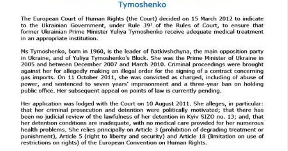 "15 марта 2012 года Европейский суд по правам человека решил указать правительству Украины, на основании правила 39-1 правил суда, обеспечить получение Юлией Тимошенко адекватной медпомощи в соответствующем учреждении", - сказано в пресс-релизе.
