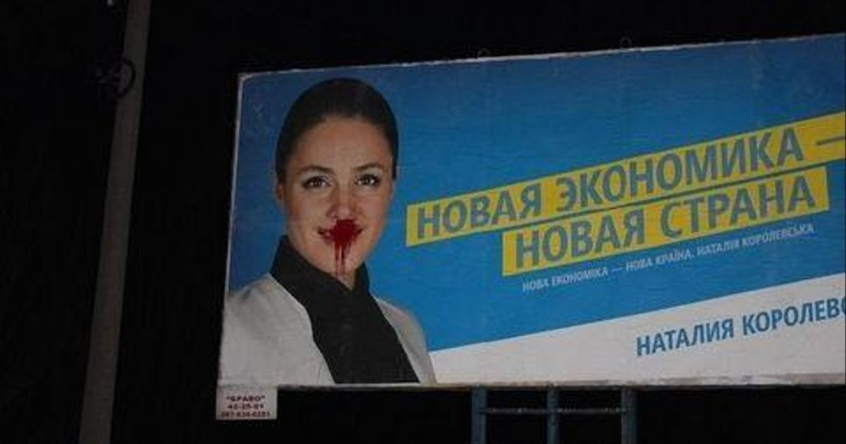 На прошлой неделе в городе Мелитополе Запорожской области неизвестные забросали билборд с изображением народного депутата, лидера УСДП Натальей Королевской.