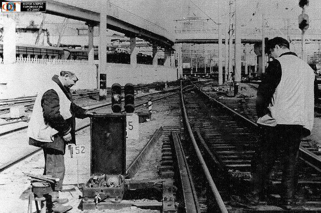 Ремонт путей на станции Киев-Пасс.Видно строящееся здание нынешнего Минтранса.