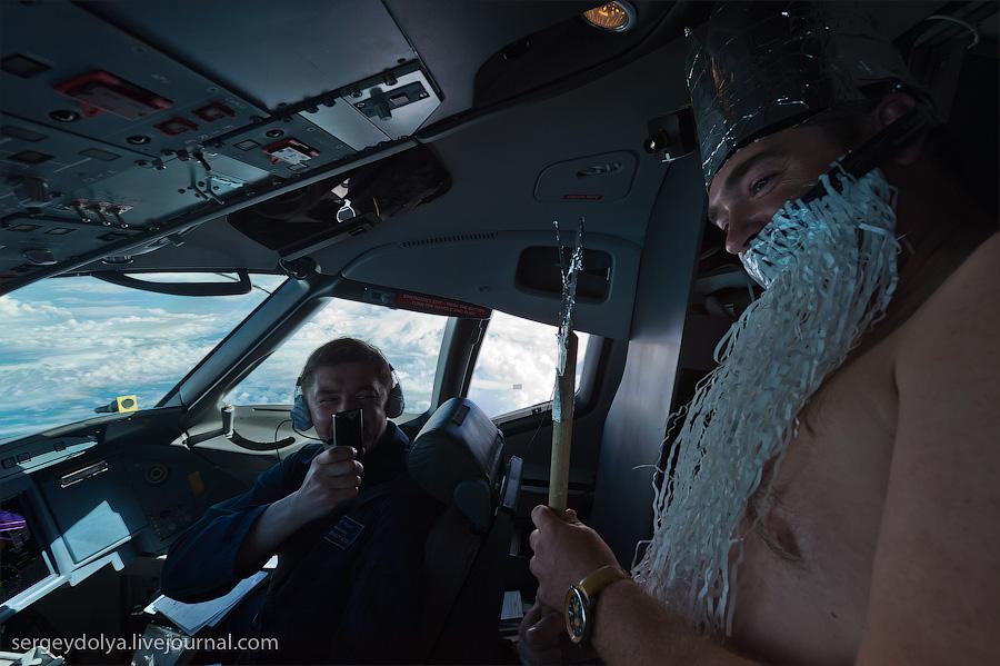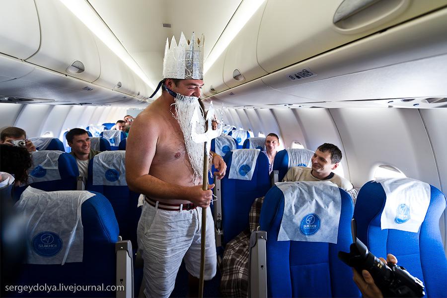 "Сегодня пересекли экватор на Сухом Суперджете. Экватор географический и экватор нашего путешествия, то есть мы уже побывали в трех странах (Казахстан, Пакистан и Мьянма) и нам осталось еще 3 страны (Индонезия, Лаос и Вьетнам). Во время пересечения экватора устроили праздник Нептуна, причем Нептуном назначили меня. Я ходил по самолету с трезубцем в сопровождении 3 полуголых русалок, которые брызгали на всех соленой водой и угощали шампанским.