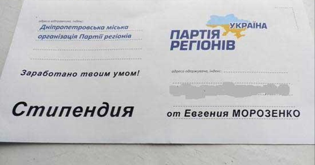 На конвертах в качестве отправителя значилась «Днепропетровская городская организация Партии регионов», от Евгения Морозенко. Размер стипендии составил 50 гривен.