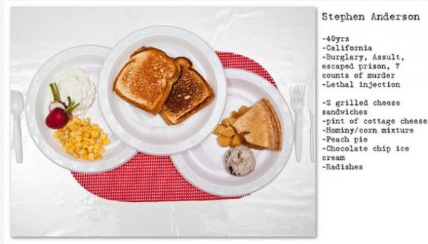 Стивен Андерсон, осуждённый за многочисленные убийства и побег из тюрьмы, полакомился горячими бутербродами с сыром, кукурузой, редиской, персиковым пирогом и мороженным с кусочками шоколада.
