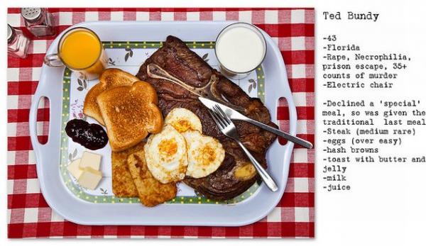 "Нейлоновый убийца" Тэд Банди, окончивший жизнь на электрическом стуле в 1989 году, получил стейк, деруны, яйца, тосты с маслом, молоко и сок.