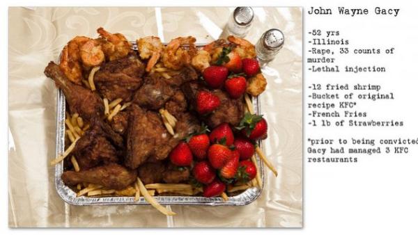 А серийный убийца Джон Уейн Гейси, убивший больше тридцати человек, захотел жареных креветок, картошки фри, курятинки с фаст-фуда KFC и свежей клубники.