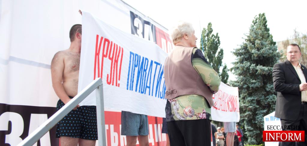 Кроме этого, активисты из числа молодежи весьма красочно выразили свое отношение к инициаторам закона о портах Украины. Они вышли на сцену в трусах с плакатом в руках «Крук раздевая порт, ты раздеваешь Измаил»!