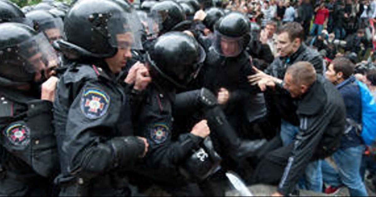 Также пострадали и некоторые правоохранители. В частности, у одного из них слетел шлем, а один из митингующих подобрал его и стал им бить по другим беркутовцам.
