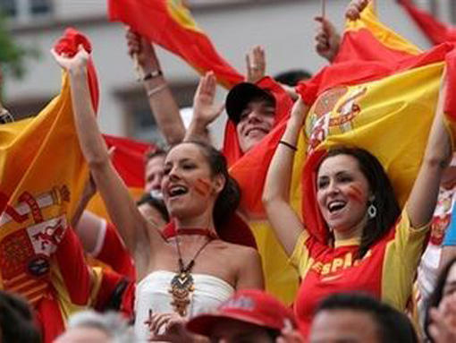 Болельщицы сборной Испании размахивают национальным флагом.