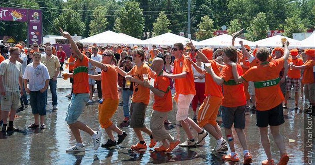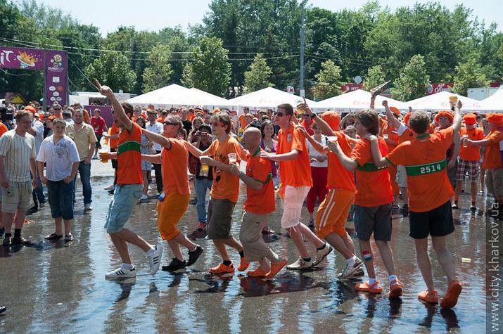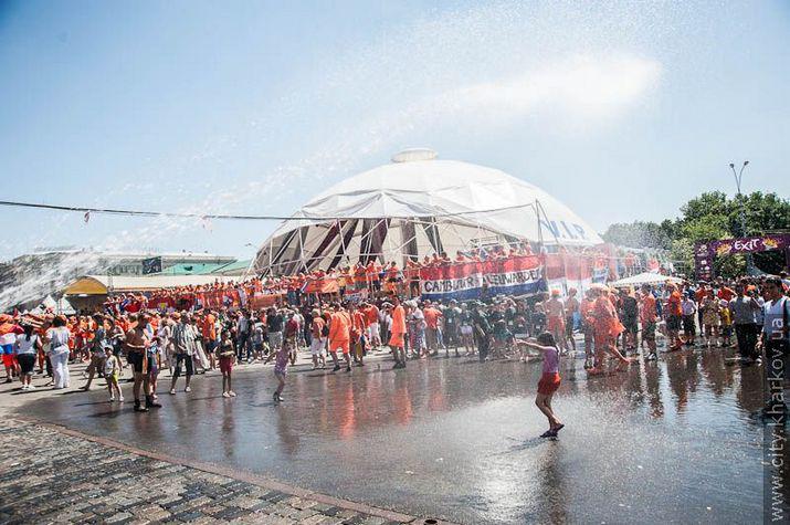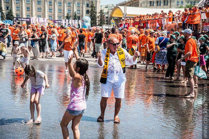В харьковской фан-зоне на площади Свободы голландских фанатов спасает от жары поливочная машина.