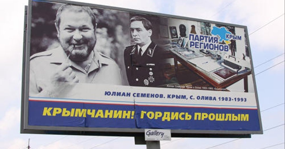 Бигборд посвящен известному советскому писателю Юлиану Семенову. На нем написано: «Крымчанин! Гордись прошлым », - передает Цензор.НЕТ.