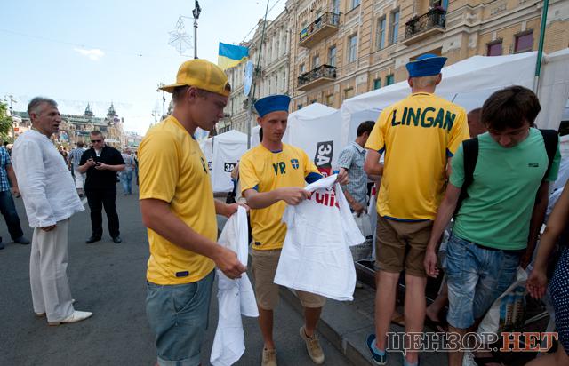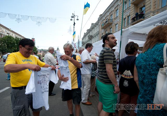 Болельщики охотно подходили за получением футболок, а шведские фаны даже выстроились в очередь, - передает Цензор.НЕТ.