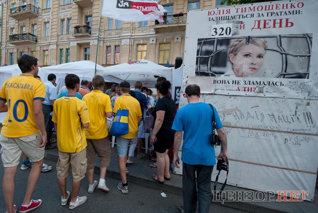На Крещатике в палаточном городке представители объединенной оппозиции "Батькивщина" раздают болельщикам футболки с надписью "Free Yulia".