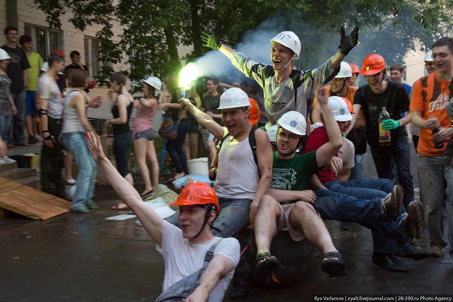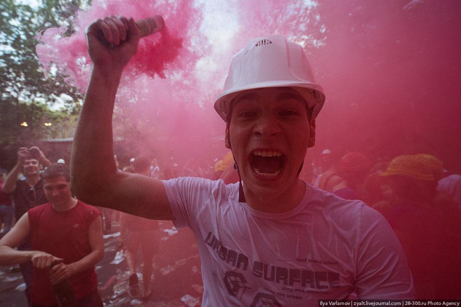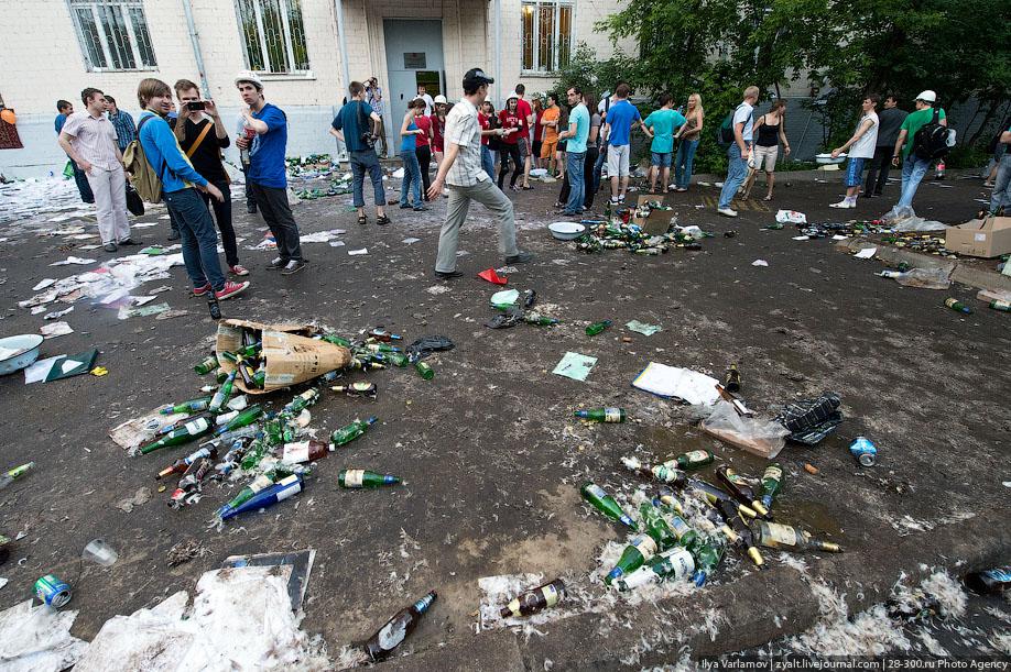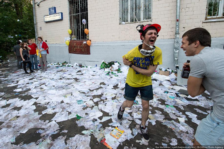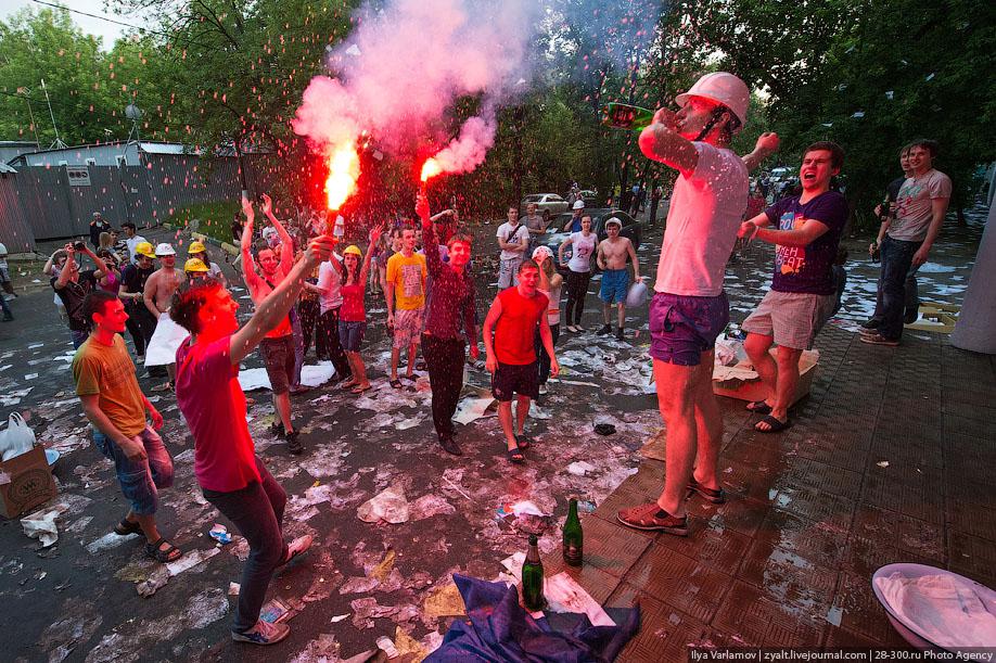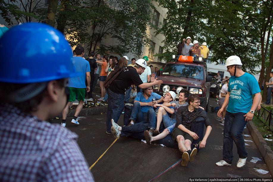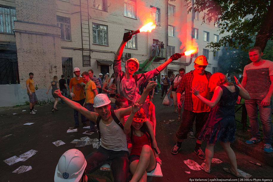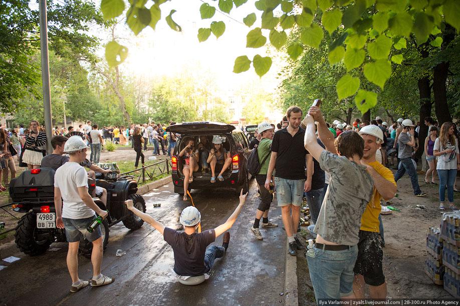 "Традиционное катание на хозяйственных тазиках, ваннах и диванах прошли у выпускников МГТУ имени Баумана в Москве. Из окон летят конспекты, в центре двора большая дискотека, со всех сторон фонтаны из пива и шампанского. Этой традиции уже много лет. Каждый год в июне жители домов в районе метро "Измайловская" могут наблюдать, как сотни выпускников веселятся, обливаются пивом и катаются на тазиках за машинами. Сегодня были самые массовые и веселые заезды", - цитирует Цензор.НЕТ блоггера zyalt.