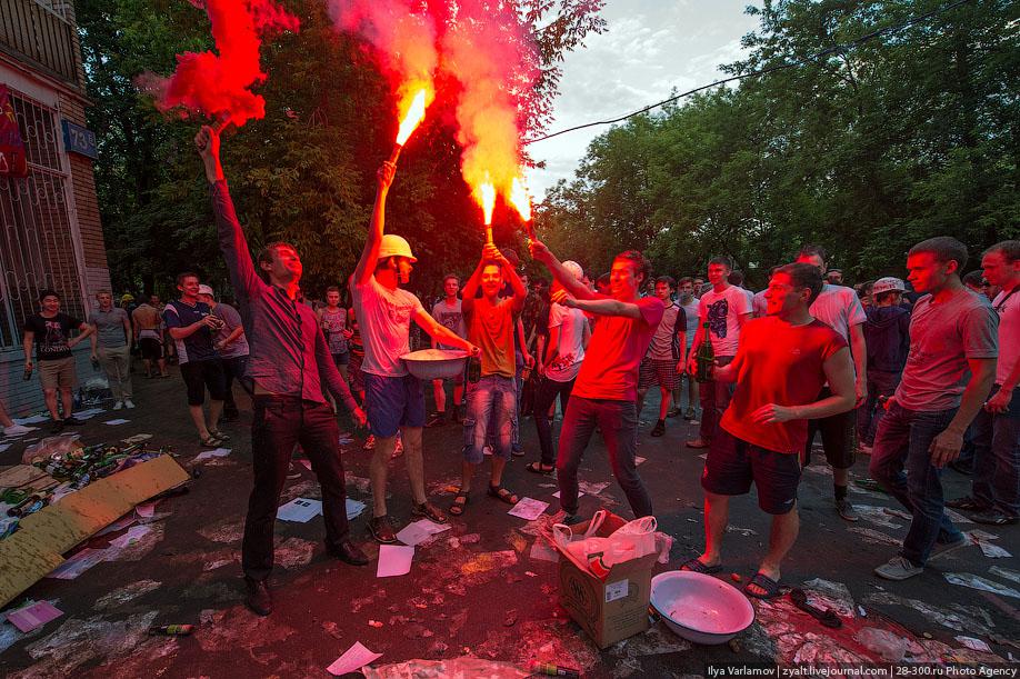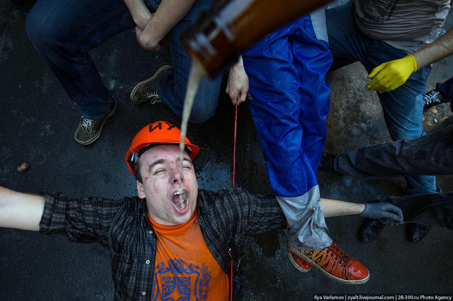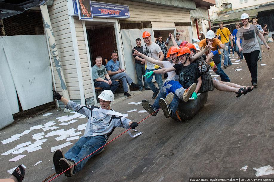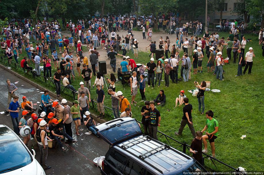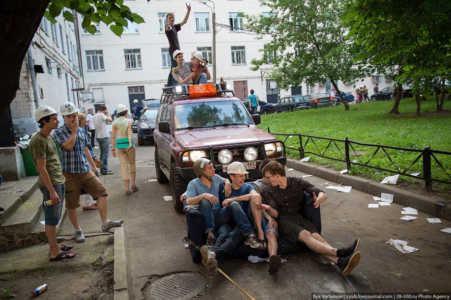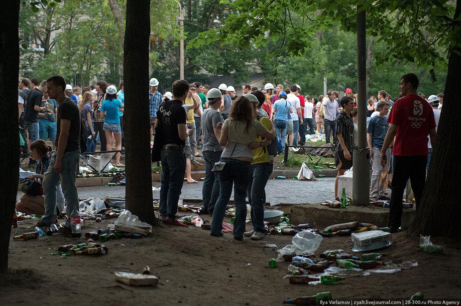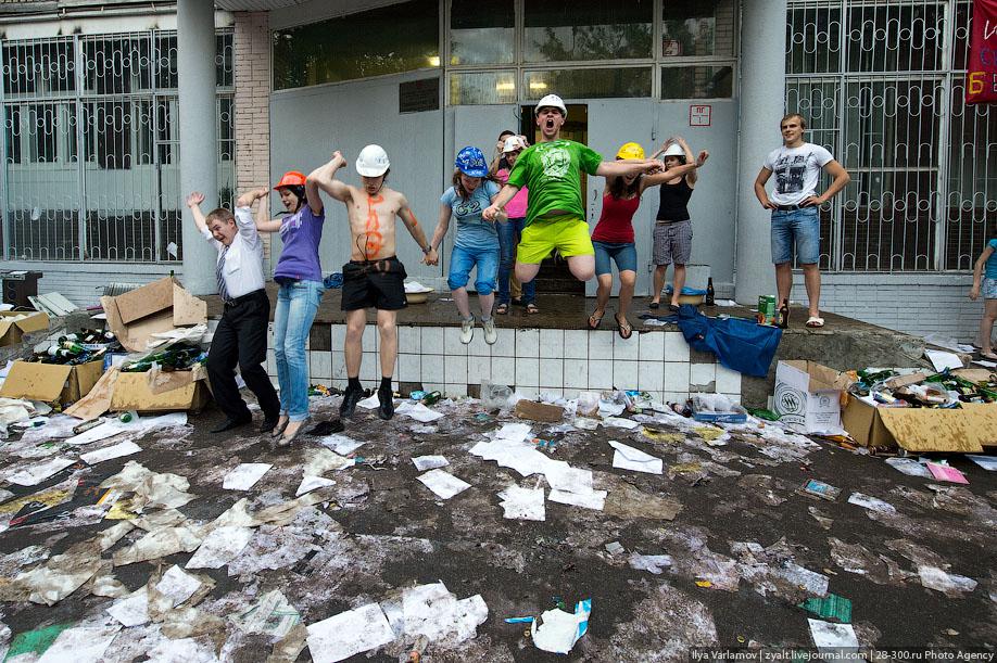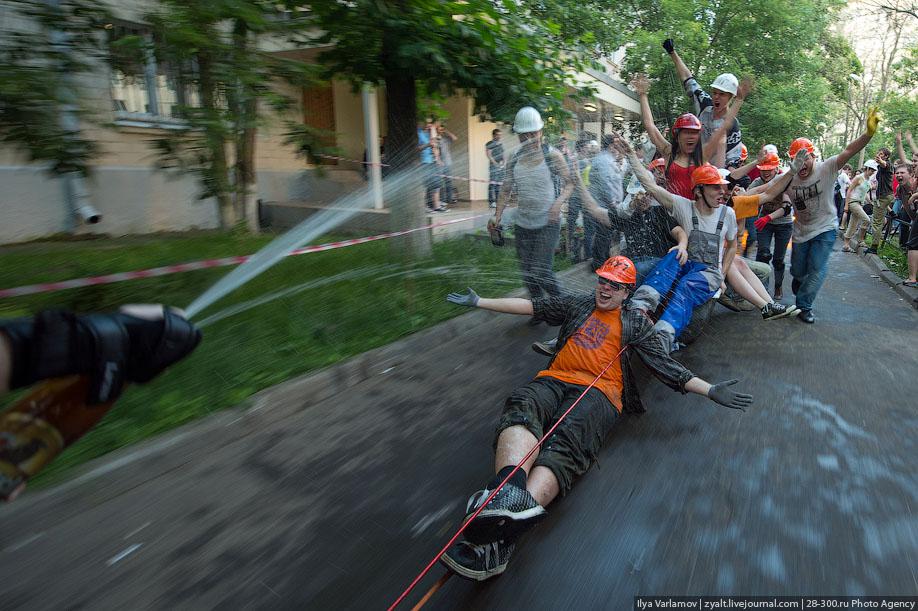 "Традиционное катание на хозяйственных тазиках, ваннах и диванах прошли у выпускников МГТУ имени Баумана в Москве. Из окон летят конспекты, в центре двора большая дискотека, со всех сторон фонтаны из пива и шампанского. Этой традиции уже много лет. Каждый год в июне жители домов в районе метро "Измайловская" могут наблюдать, как сотни выпускников веселятся, обливаются пивом и катаются на тазиках за машинами. Сегодня были самые массовые и веселые заезды", - цитирует Цензор.НЕТ блоггера zyalt.